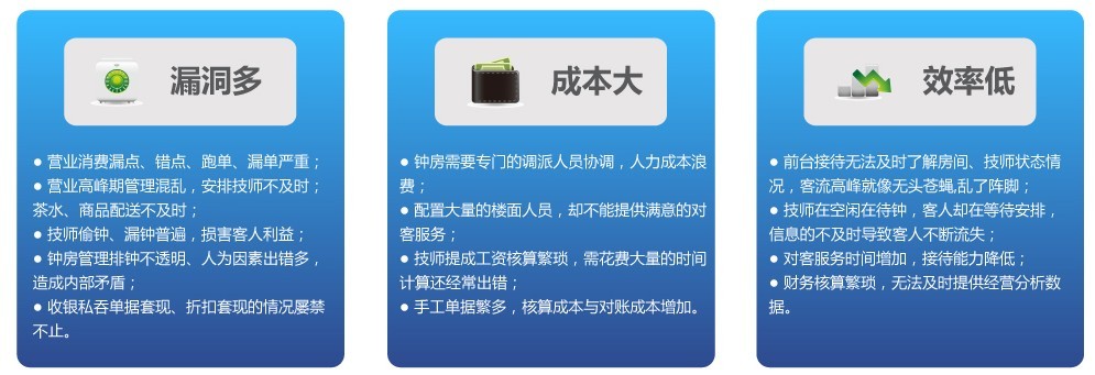 员工人事资料管理(含入职登记、发还智能卡、更换班群、离职登记等);员工考勤管理(登记请假)等,统计上、下班缺勤情况等);技师处罚管理(登记处罚缘由,罚款金额,改进措施及后续表现等);综合统计查询报表(营业收入分析报表,甚至按时段客流及营业分析等)